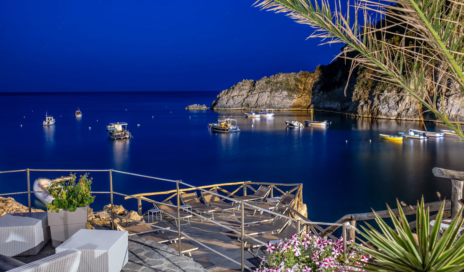 Restaurante informal a pie del agua en una bahía escondida iluminada por pequeñas linternas. Cocina mediterránea tradicional, pescado fresco y pasta.