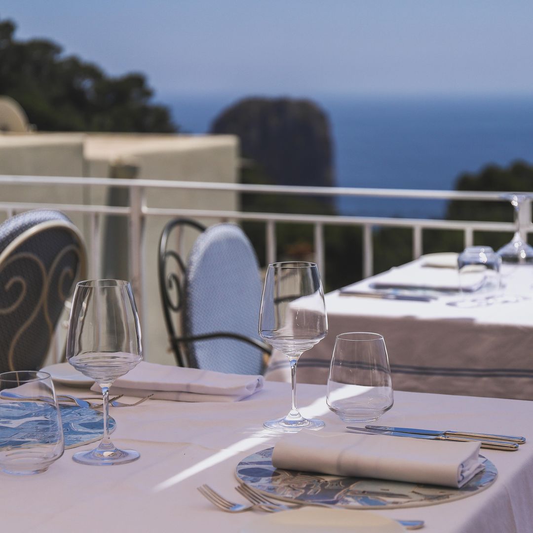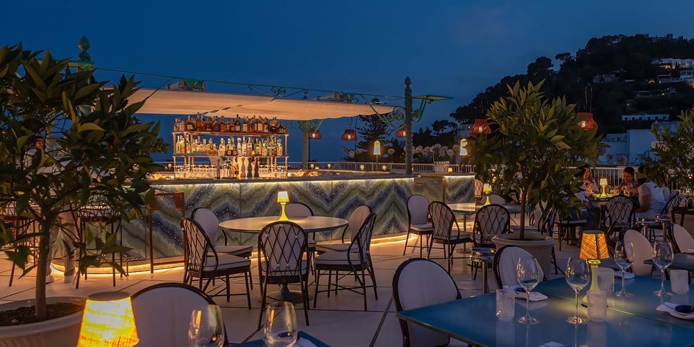 Encima del Hotel Luna, junto a los Jardines de Augusto, con vistas a las rocas Faraglioni. Cocteles únicos inspirados en los sabores de Capri.