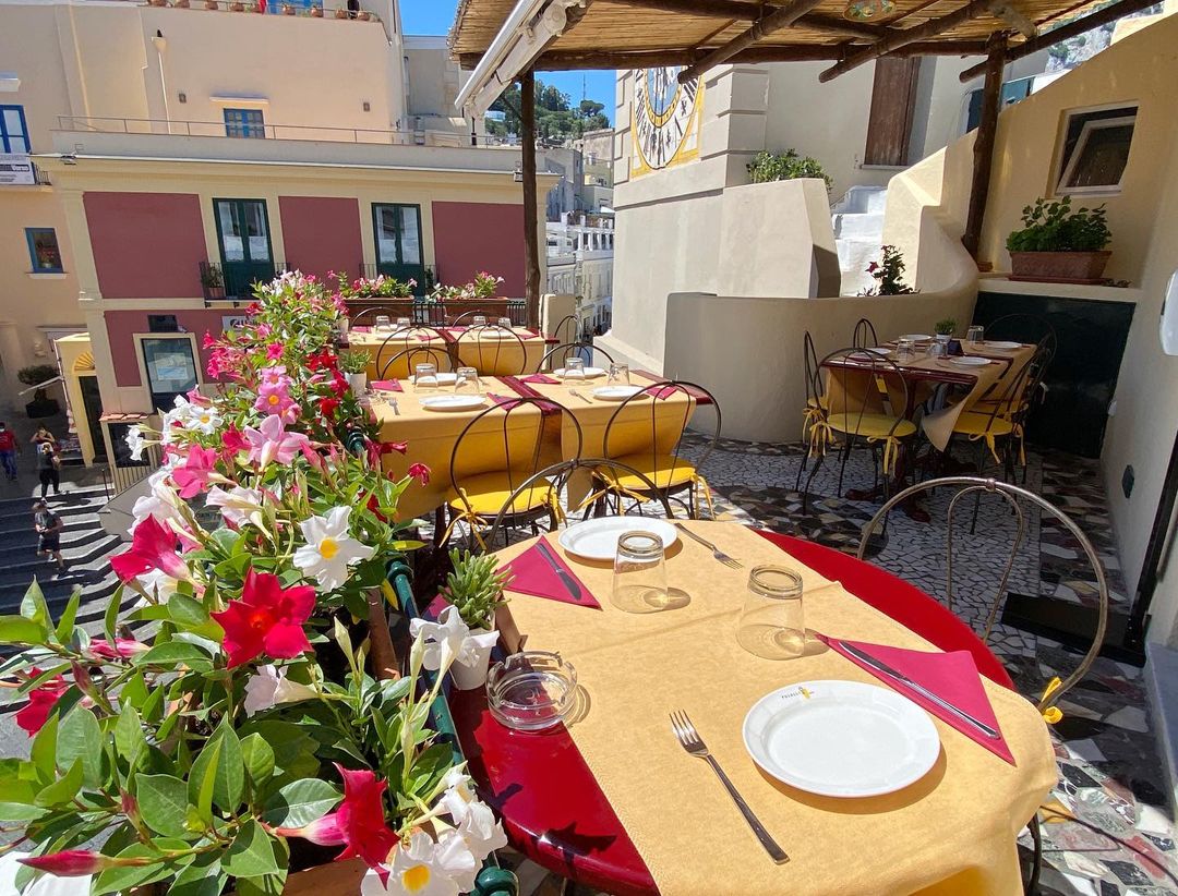 Un jardín secreto en el corazón de Capri con un comedor amplio y terraza cubierta. Cocina mediterránea con una selección variada de pescados y mariscos.
