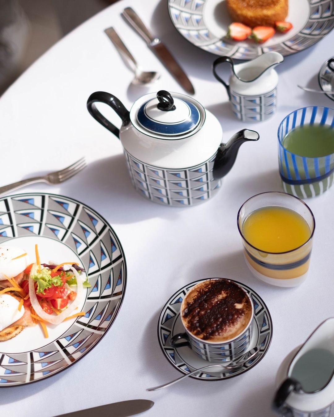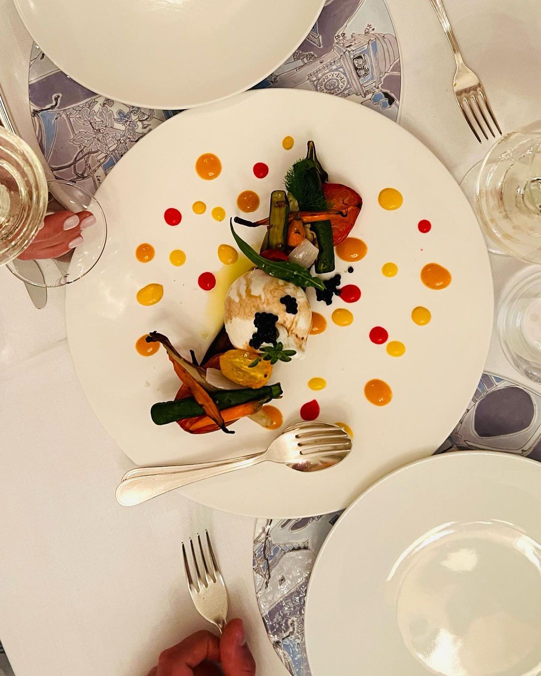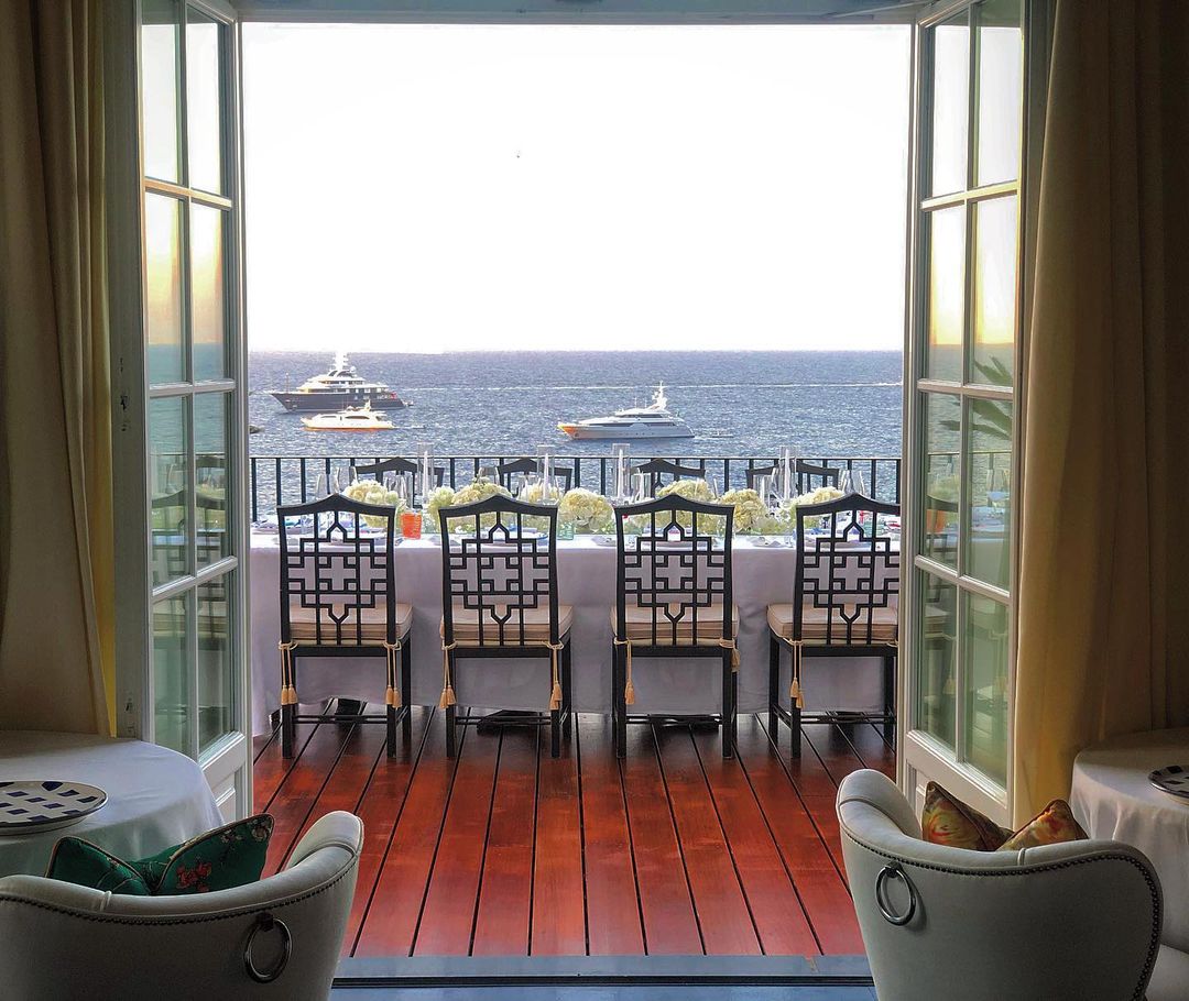 Restaurante glamuroso con una tienda emergente de Dior y ambiente mediterráneo. Ofrece platos marítimos tradicionales con pescado fresco y mariscos.
