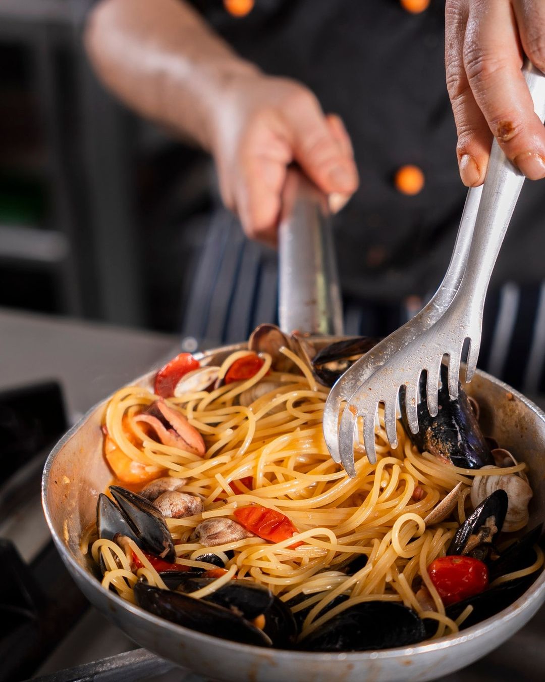 Restaurante informal con vistas al mar. Espaguetis con calabacín, linguini con cicala y sopa de pescado.