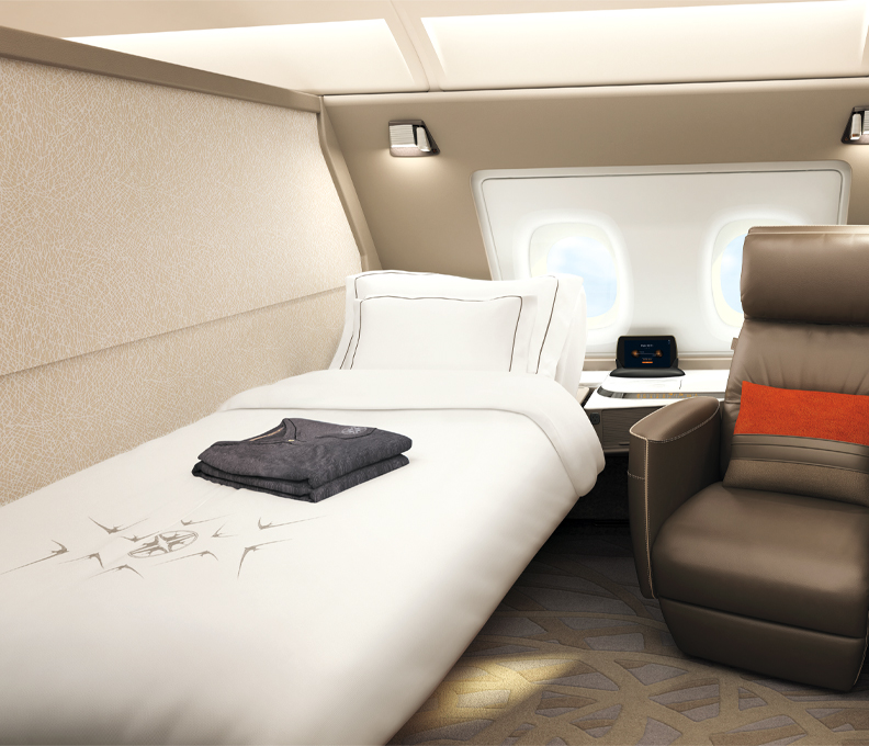 Una experiencia de primera clase que es sinónimo de calidad y lujo. Cada cabina está diseñada con materiales exclusivos. Complementando la experiencia que se vive dentro del avión, también existe su recientemente inaugurado lounge en París, que incluye tratamientos de spa para hacer un vuelo menos agotador.
