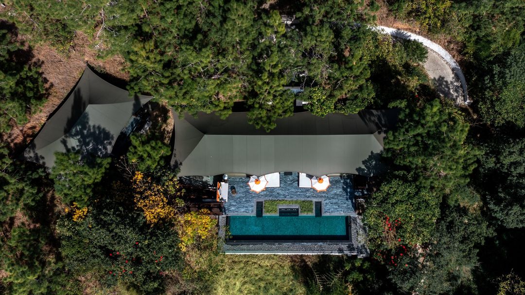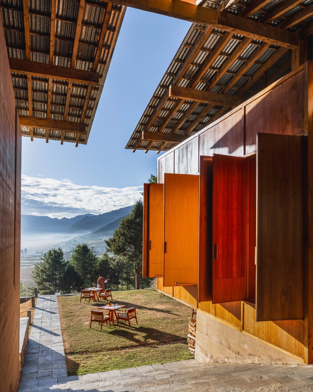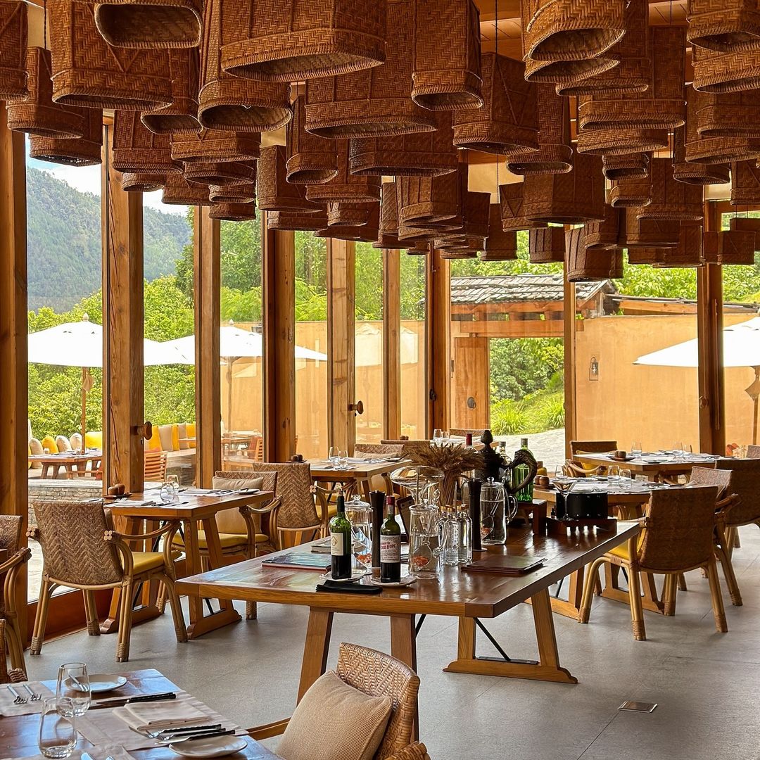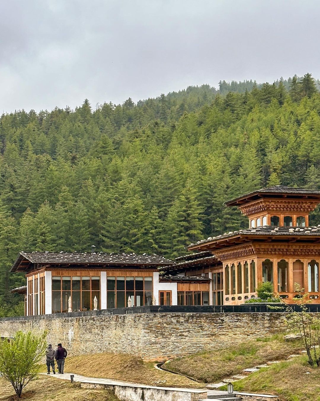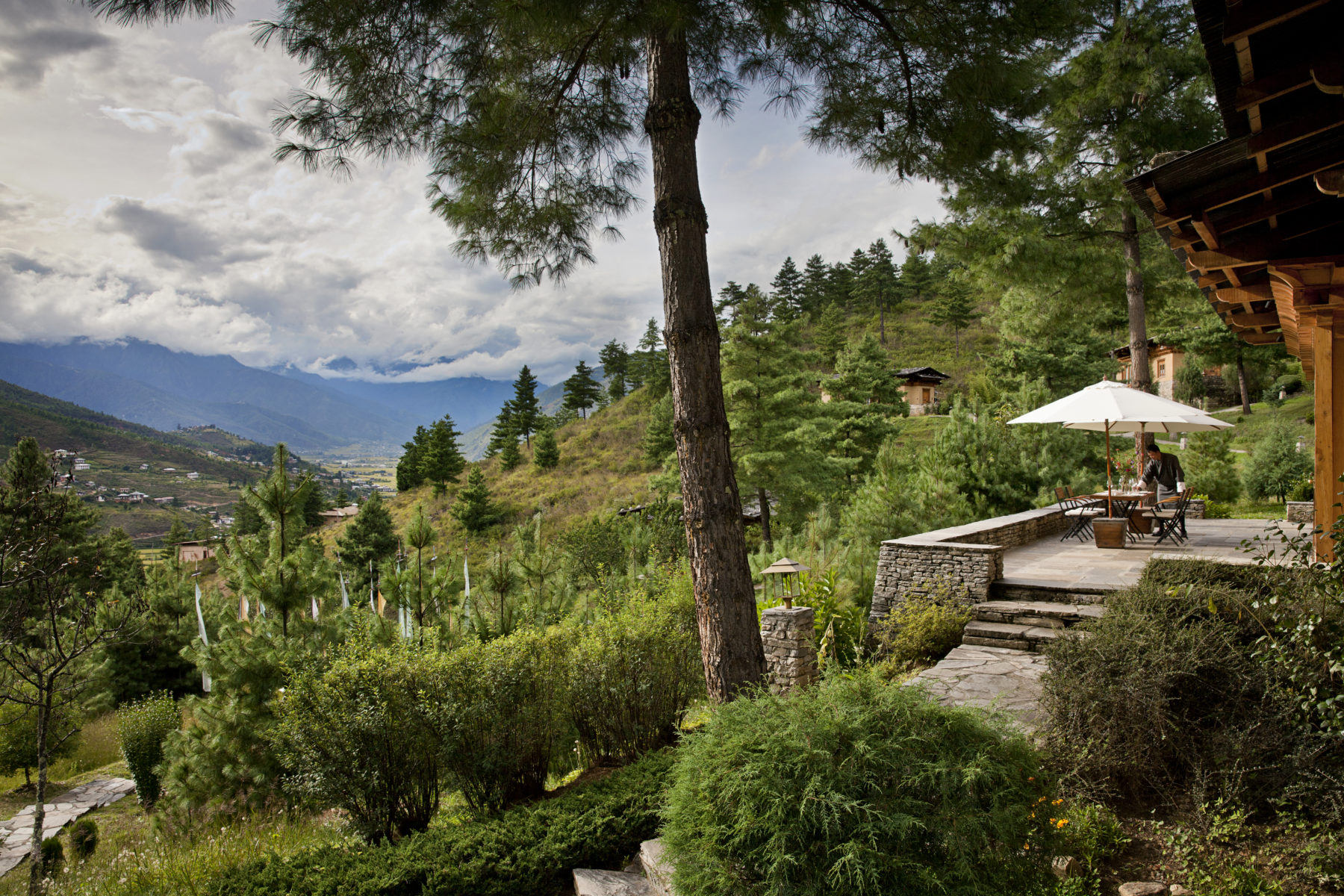Al combinar el lujo con la sostenibilidad, el hotel ubicado entre huertos de manzanas y bosques de pinos destaca por sus vistas a las luces de Thimphu desde una colina. Este resort ofrece 25 villas y suites. Además se distingue por su compromiso con las prácticas ecológicas, las cuales contribuyen al status de Bután como el único país carbono-negativo del mundo.
