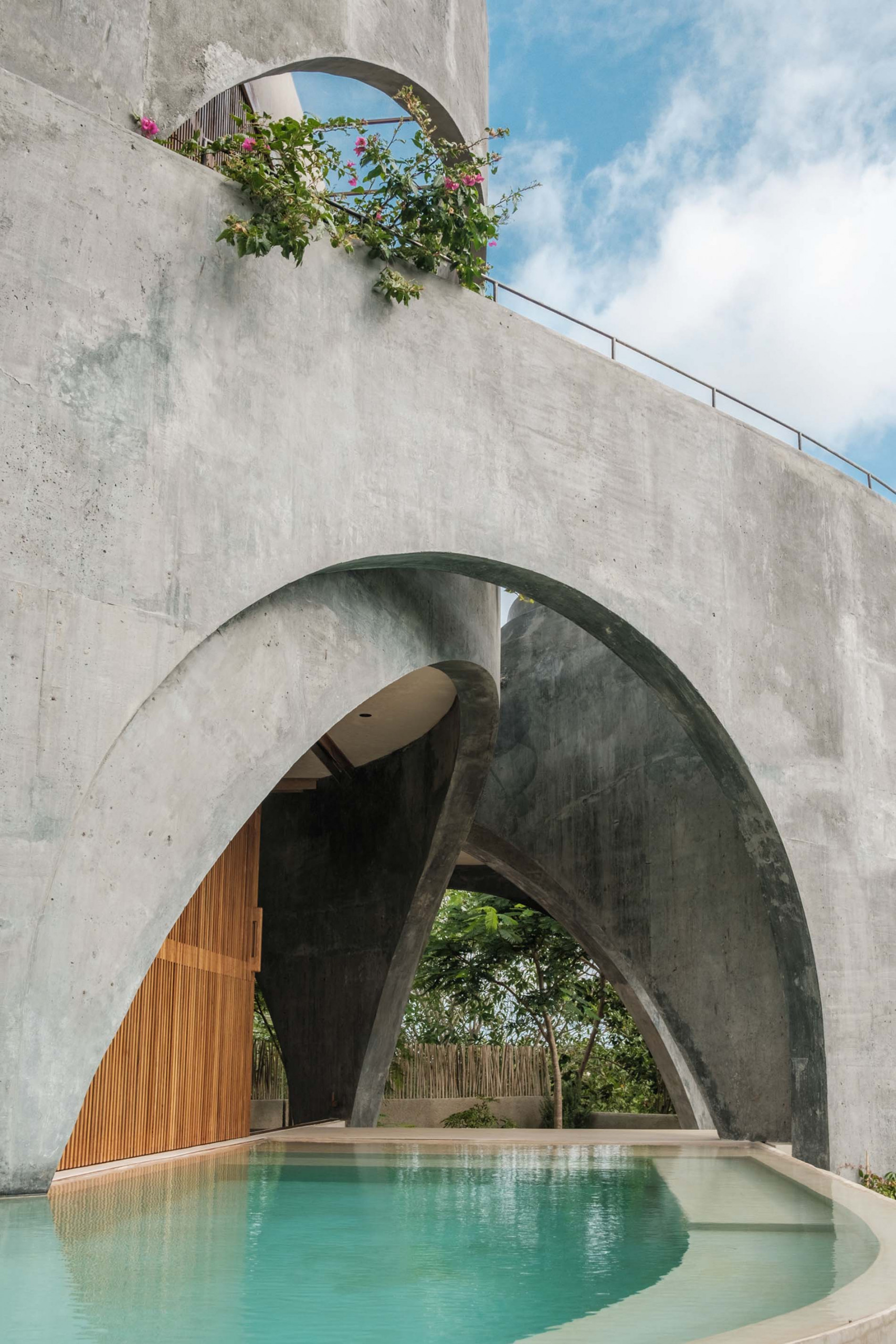 En Puerto Escondido, se encuentra Casa Toro, una creación de Miguel Carroll que reinterpreta la arquitectura de forma vanguardista. Esta villa de dos habitaciones, a solo unos pasos de una de las playas más famosas para el surf en México, se distingue por sus líneas fluidas y el uso del concreto moldeado, logrando una estructura que resalta en esta costa. Las terrazas circulares y los pasillos en arco ofrecen vistas panorámicas que permiten a los visitantes sumergirse en una experiencia visual única. Tanto la piscina infinita que envuelve la propiedad como las lámparas de concha que proyectan la luz sobre la terraza muestran la atención al detalle de Carroll, quien promete ser una referencia en la arquitectura contemporánea mexicana.