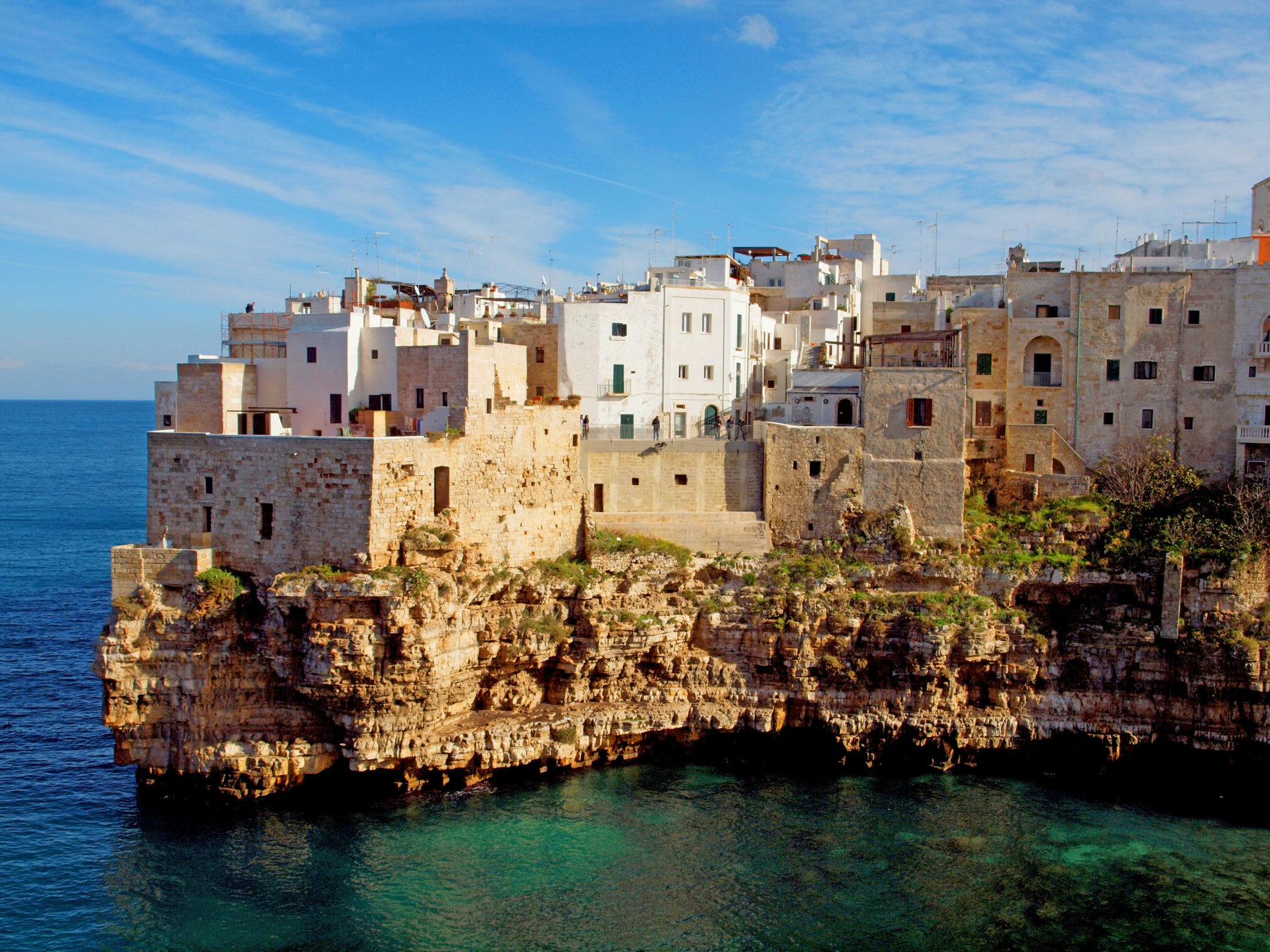 Entre las viviendas trulli de piedra seca en Alberobello, catedrales frente al mar en Trani y palacios barrocos en Lecce, focaccia crujiente y pane di Altamura, Puglia refleja su historia e identidad mediterráneas. Pueblos blancos con calles estrechas y casas encaladas contrastan con fortalezas normandas y castillos octogonales que dominan el paisaje, mientras los mercados locales y las plazas completan el escenario de esta región del sur de Italia.